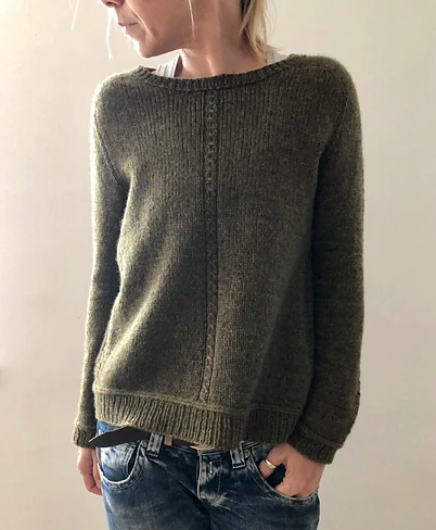 Forager is worked seamlessly from the top down. The yoke is shaped by using a modified version of the contiguous set-in sleeves method developed by Susie Myers. First the yoke is worked back and forth to the final neck CO. When the neck shaping is complete, the yoke is worked in rounds to sleeve separation. The sleeve stitches are placed on hold and the underarm stitches are cast on. Then the body is worked in rounds to the twisted braid and ribbing. The sleeve stitches are then picked up again to work the sleeve in rounds, top down, to the cuffs. Neck finishing is worked last.